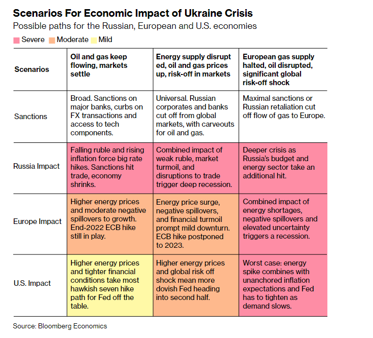 Just how big a blow the conflict ends up delivering to the global economy will depend on its length and scope, the severity of Western sanctions, and the possibility that Russia might retaliate. There's the potential for other twists too, from an exodus of Ukrainian refugees to a wave of Russian cyber attacks.